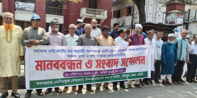 নিজস্ব প্রতিবেদকঃ অবসরপ্রাপ্ত এমপিওভুক্ত বেসরকারি শিক্ষক-কর্মচারীদের বকেয়া অবসর ভাতা ও কল্যাণ ভাতা দ্রুত প্রদানের দাবিতে বরিশালে বিক্ষোভ মিছিল, মানববন্ধন ও সংবাদ সম্মেলন অনুষ্ঠিত হয়েছে। শনিবার (১১ এপ্রিল ) সকাল ১০টায় অবসরপ্রাপ্ত এমপিওভুক্ত বেসরকারি শিক্ষক-কর্মচারী কল্যাণ সমিতি, বরিশাল জেলা কমিটির উদ্যোগে এ কর্মসূচি পালন করা হয়।