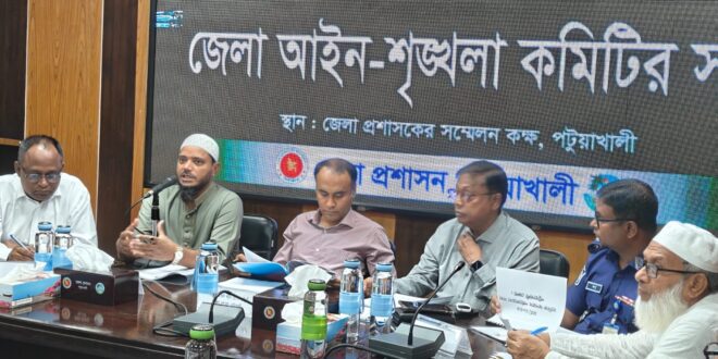 রোববার সকালে পটুয়াখালী জেলা প্রশাসকের সম্মেলন কক্ষে আয়োজিত এই সভায় জেলার সার্বিক আইন-শৃঙ্খলা পরিস্থিতি নিয়ে বিস্তারিত আলোচনা হয় এবং তা আরও উন্নত করার লক্ষ্যে গুরুত্বপূর্ণ সিদ্ধান্ত গৃহীত হয়।