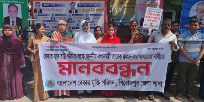 রবিবার (১২ এপ্রিল) সকাল ১০টায় জেলা প্রশাসকের কার্যালয়ের সামনে এ মানববন্ধন অনুষ্ঠিত হয়। বাংলাদেশ বেকার মুক্তি পরিষদ পিরোজপুর জেলা শাখার সভাপতি তাছমিয়া আক্তারের সভাপতিত্বে মানববন্ধনে উপস্থিত ছিলেন সংগঠনের সাধারণ সম্পাদক বাপ্পি চন্দ্র হালদার, জিয়ানগর উপজেলার সভাপতি ইতি রানি, নাজিরপুর উপজেলার সভাপতি নুপুর সাহা, ভান্ডারিয়া উপজেলার সাধারণ সম্পাদক কুরছিয়া আক্তার সহ অন্যান্যরা।