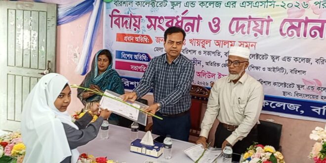 বরিশাল কালেক্টরেট স্কুলের এসএসসি ২০২৬ পরীক্ষার্থীদের বিদায় সংবর্ধনা ও দোয়া মোনাজাত অনুষ্ঠিত হয়েছে।
