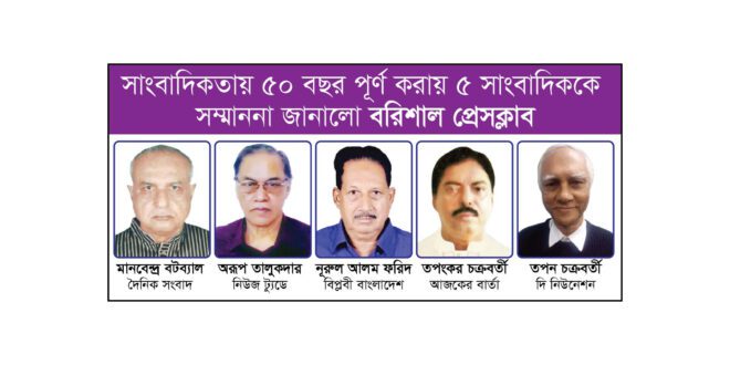 সাংবাদিকতায় পঞ্চাশ বছরপূর্ণ করা বরিশাল প্রেসক্লাবের পাঁচজন জ্যেষ্ঠ সাংবাদিককে সম্মাননা প্রদান করা হয়েছে ।