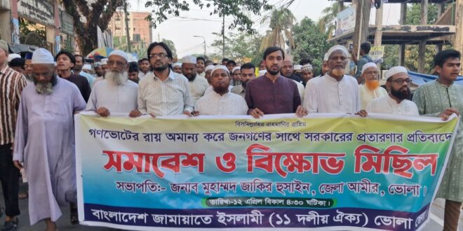 গণভোটের রায় অমান্য করে জনগণের সঙ্গে প্রতারণার অভিযোগে ভোলায় বিক্ষোভ সমাবেশ ও মিছিল করেছে ১১ দলীয় জোট।