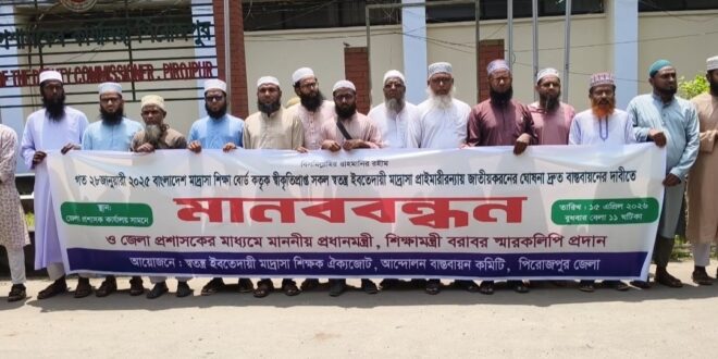 পিরোজপুরে স্বতন্ত্র ইবতেদায়ী মাদ্রাসা জাতীয়করণের দাবিতে মানববন্ধন ও স্মারকলিপি প্রদান করা হয়েছে। বুধবার (১৫ এপ্রিল) সকাল ১১টার দিকে জেলা প্রশাসকের কার্যালয়ের সামনে স্বতন্ত্র ইবতেদায়ী মাদ্রাসা শিক্ষক ঐক্যজোটের উদ্যোগে ঘণ্টাব্যাপী এ মানববন্ধন কর্মসূচি পালিত হয়।