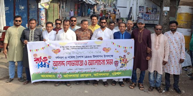 “যা কিছু পুরোনো, তা হোক ইতিহাস, নতুন বছরে হোক নতুন আশ্বাস” এই প্রতিপাদ্যকে সামনে রেখেই বরিশালের আগৈলঝাড়া ঐতিহ্যবাহী প্রেসক্লাবের বাংলা ১৪৩৩ বঙ্গাব্দকে বরণ। মঙ্গলবার আগৈলঝাড়া প্রেসক্লাবের আয়োজনে পহেলা বৈশাখ উপলক্ষে দিনব্যাপী নানা আয়োজনের মধ্য দিয়ে বৈশাখী শোভাযাত্রা, বৈশাখী ভোজ ও সাংস্কৃতিক অনুষ্ঠানের মাধ্যমে প্রেসক্লাব অঙ্গন মুখরিত হয়ে ওঠে।