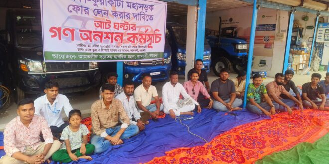আমতলী প্রতিনিধি : ভাঙ্গা-বরিশাল ভায়া আমতলী কুয়াকাটা আঞ্চলিক মহাসড়ক চার লেন করার দাবীতে বৃহস্পতিবার সকাল ১০টা থেকে ৬টা পর্যন্ত ৮ঘন্টা ব্যাপী গণ অনশন কর্মসূচী পালন করা হয়। আমতলী সচেতন নাগরিক মহল নামের ব্যানারে এই গণ অনশন কর্মসূচীর আয়োজন করা হয়।