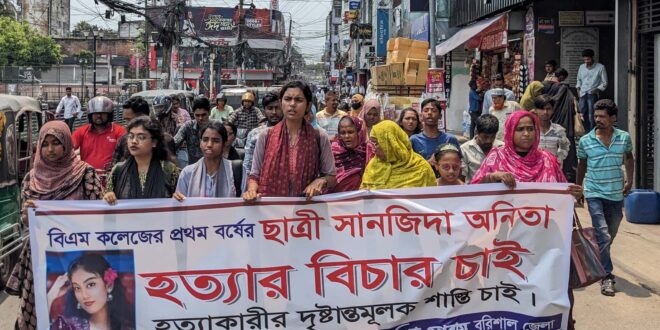 নিজস্ব প্রতিবেদক : বরিশালে সমাজতান্ত্রিক ছাত্র ফ্রন্ট ও সমাজতান্ত্রিক মহিলা ফোরামের উদ্যোগে সানজিদা কবির আনিতা হত্যার বিচারের দাবিতে মানববন্ধন ও বিক্ষোভ মিছিল অনুষ্ঠিত হয়েছে।
