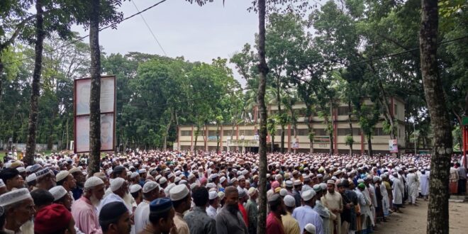হাজার হাজার মানুষের অশ্রুভেজা দু’আ নিয়ে বিদায় নিলেন হাজারো আলেমের উস্তাদ, বাহের চর ইসলামিয়া ফাজিল (ডিগ্রী) মাদ্রাসার অবসরপ্রাপ্ত অধ্যক্ষ, বাংলাদেশ মাদ্রাসা শিক্ষক পরিষদের বরিশাল জেলার সাবেক সহ-সভাপতি, গবিন্দপুর ইউনিয়ন পরিষদের পাঁচ বার নির্বাচিত সাবেক সফল চেয়ারম্যান, হিজলা উপজেলা পরিষদের সাবেক ভারপ্রাপ্ত চেয়ারম্যান, হিজলা উপজেলা পরিষদ জামে মসজিদের সাবেক খতিব, জাতীয় ইমাম সমিতি বরিশাল জেলার সাবেক সহ-সভাপতি, বাংলাদেশ জামায়াতে ইসলামী হিজলা উপজেলার সাবেক আমীর জননেতা অধ্যক্ষ মাওলানা আবুল হাশেম মোঃ বশিরুল্লাহ (রাহিমাহুল্লাহ)। রবিবার (২ জুন) বিকাল ৫:৩০টায় হিজলা উপজেলা পরিষদ কমপ্লেক্স মাঠে মরহুমের জানাজা নামাজ অনুষ্ঠিত হয়। জানাজায় ইমামতি করেন মরহুমের সেজো ছেলে এ্যাডভোকেট হাফেজ মো: ইউনুছ।
