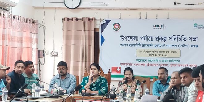 বরগুনার বামনা উপজেলায় জেন্ডার ইকুয়ালিটি ট্রান্সফর্ম ক্লাইমেট এ্যাকশন প্রকল্প’র অবহিকরণ সভা অনুষ্ঠিত হয়েছে। রবিবার উপজেলার সরকারি-বেসরকারি প্রতিষ্ঠান, সাংবাদিক, শিক্ষক, জনপ্রতিনিধিসহ বিভিন্ন পর্যায়ের ব্যক্তিবর্গের অংশগহনে বেসরকারি উন্নয়ন সংস্থা জাগোনারী ও ওয়েব ফাউন্ডেশর যৌথভাবে উপজেলা পরিষদ হলরুমে এ সভার আয়োজন করে। বাংলাদেশের জলবায়ু ঝুঁকিপূর্ণ এলাকায় জেন্ডার-দায়বদ্ধ জলবায়ু ন্যায়বিচার কর্মসূচি বাস্তবায়ন এ সভার অন্যতম লক্ষ্য।
