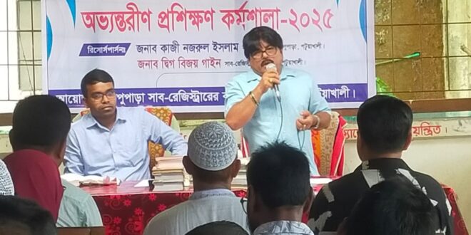 পটুয়াখালীর কলাপাড়া সাব-রেজিষ্টার কার্যালয়ের স্থায়ী কর্মচারী, নকল নবীশ ও দলিল লেখকদের দক্ষতা বৃদ্ধি, স্বচ্ছতা ও জবাবদিহিতা জোরদার করনের লক্ষ্যে অভ্যন্তরীণ প্রশিক্ষণ কর্মশালা-২০২৫ অনুষ্ঠিত হয়েছে। মঙ্গলবার সকালে উপজেলা সাব রেজিস্টার কার্যালয়ের হলরুমে অনুষ্ঠিত এ প্রশিক্ষণ কর্মশালার উদ্বোধন করেন কলাপাড়া সাব রেজিস্টার কাজী নজরুল ইসলাম।