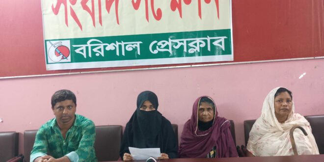 মঙ্গলবার (২৪ জুন) বরিশাল প্রেসক্লাবে আয়োজিত এক সংবাদ সম্মেলনে এমন অভিযোগ করেছেন ভুক্তভোগী তিন বিধবা নারী। বেলা ১২টায় ক্লাবের হলরুমে ভুক্তভোগী মৃত শামছুল আলম খানের স্ত্রী নাদিরা আলম খান, তার ভাই মৃত নুরুল আলম খানের স্ত্রী শামীমা বেগম ও মৃত হিরু আলম খানের স্ত্রী রানু বেগম এ সংবাদ সম্মেলন আয়োজন করেন। তারা তিনজনেই বানারীপাড়া উপজেলার সলিয়াবাকপুর এলাকার স্টেশন-বোর্ড স্কুল সংলগ্নের বাসিন্দা।