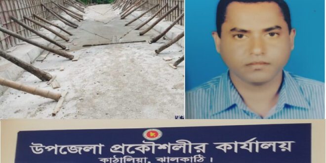 কাঠালিয়া উপজেলার ৫ নং শৌজলিয়া ইউনিয়নের সোনার বাংলা বাজার সংলগ্ন তালগছিয়া গ্রামের খালে প্রায় ২ কোটি ২২ লক্ষ টাকায় নির্মাণাধীন গার্ডার ব্রিজ ২২ জুন রাতে ঢালাই দেয়ার পরেই রাতে ঢেবে গেছে ব্রিজটি।ব্রিজটির তদারকির দ্বায়িত্বে ছিলেন জিয়াউর রহমান।তার গাফিলতি ও তদারকির অভাবে ব্রিজটি ঢেবে গেছে।কারন হিসেবে স্থানীয় লোকজন জানায়,জিয়াউর রহমান ঢালাইয়ের দিন ছিলনা।নিম্মমানের মালামাল দেয়ার কারনেই ব্রিজটি মাঝখান দিয়ে ঢেবে গেছে।