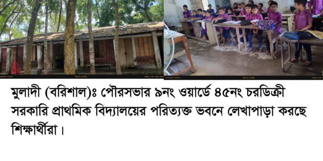 বরিশালের মুলাদী পৌরসভার ৯নং ওয়ার্ডে অবস্থিত ৪৫নং চরডিক্রী সরকারি প্রাথমিক বিদ্যালয় বহুদিন ধরে পরিত্যক্ত। এ পরিত্যক্ত ভবনে জীবনের ঝঁকি নিয়ে লেখাপাড়া করছে কমলমতী শিক্ষার্থীরা আর পাঠদান করে আসছে শিক্ষকগণ। বিদ্যালয়ে সামান্য বৃষ্টি হলেই শ্রেণীকক্ষে পানি পড়ে, ছাদ চুইয়ে পানি ঝরে। বেঞ্চের সংকটের কারণে নানাবিধ সমস্যায় দুর্ভোগ পোহাচ্ছে শিক্ষার্থীরা। বিদ্যালয়ে ২১২ জন শিক্ষার্থী রয়েছে। এ ভবন ধ্বসে যাওয়ার ভয়ে বর্ষা মৌসুতে শিক্ষাথীদের সংখ্যা কমে যায়।
