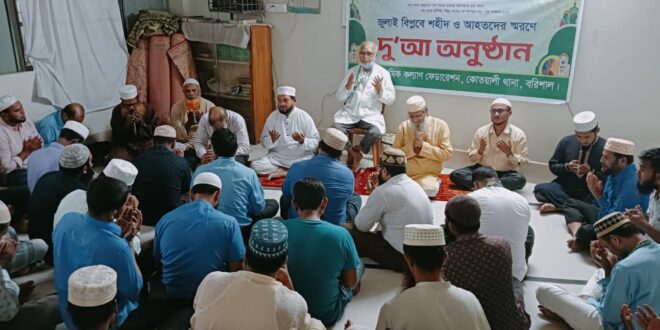 বাংলাদেশ শ্রমিক কল্যাণ ফেডারেশন বরিশাল কোতয়ালী থানা শাখার উদ্যোগে জুলাই বিপ্লবে শহীদ ও আহতদের জন্য দু’আ মাহফিল অনুষ্ঠিত হয়েছে। ২ জুলাই বুধবার জোহরবাদ চাঁদামারীতে অনুষ্ঠিত এই দোয়া অনুষ্ঠানে শতাধিক নেতাকর্মী অংশ নেন।