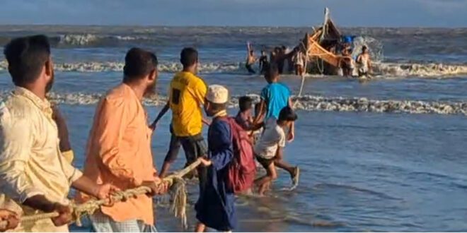 কুয়াকাটা সংলগ্ন উত্তাল বঙ্গোপসাগরে মাছ শিকারে গিয়ে ৭ জেলেসহ একটি ট্রলার ডুবির ঘটনা ঘটেছে। বুধবার দুপুরে সাগরে জাল ফেলে তীরে আসার পথে উত্তাল ঢেউয়ের তান্ডবে এ ট্রলারটি ডুবে যায়। প্রায় ৩ ঘন্টা সাগরে ভাসার পর টুরিস্ট পুলিশ, নৌ পুলিশের সহায়তায় জেলে মাহবুব মাঝি (৩১), হাসান (৩৬), মামুন ( ৩২), তানজিল (২৮), ইসমাইল (৩০), মোস্তফা (৫০), তানিম (২০) উদ্ধার করা হয়। এদের বাড়ি কুয়াকাটার বিভিন্ন গ্রামে। উদ্ধারকৃত জেলেরা সুস্থ রয়েছে। তবে শেষ বিকেলে ডুবে যাওয়া ওই ট্রলারটি উদ্ধার করা হয়েছে বলে স্থানীরা জানান। উদ্ধার হওয়া জেলার জানান, তারা ভোর চারটায় সমুদ্রে মাছ ধরার উদ্দেশ্যে রওনা করেন। সমুদ্র উত্তল থাকার কারণে তাদের ট্রলারটি সাগরে ডুবে যায়। তারা দীর্ঘ সময় সাগরে ভাসতে থাকার পর টুরিস্ট পুলিশ, নৌ পুলিশের সহায়তায় উদ্ধার হয়েছেন।