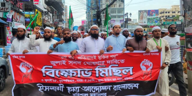জুলাই সনদ ঘোষণার দাবিতে বরিশালে ইসলামী ছাত্র আন্দোলনের বিক্ষোভ মিছিল অনুষ্ঠিত হয়েছে।বৃহস্পতিবার (০৩ জুলাই) নগরের অশ্বিনী কুমার হল চত্বর থেকে ইসলামী ছাত্র আন্দোলন বাংলাদেশ বরিশাল মহানগরের উদ্যোগে এ মিছিল অনুষ্ঠিত হয়।