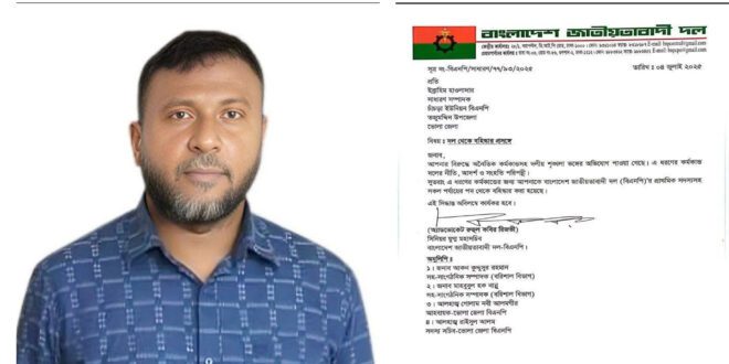 বরিশাল থেকে প্রকাশিত জনপ্রিয় দৈনিক বাংলাদেশ বাণী’তে সংবাদ প্রকাশের পর ভোলার তজুমদ্দিনের চাঁচড়া ইউনিয়ন বিএনপি সম্পাদক ইব্রাহীম হাওলাদারকে বহিস্কার করেছে জাতীয়তাবাদী দল বিএনপি।