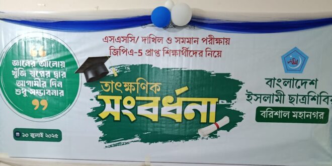 বাংলাদেশ ইসলামী ছাত্রশিবির বরিশাল মহানগর কর্তৃক আয়োজিত এসএসসি/দাখিল ও সমমান পরীক্ষায় জিপিএ-৫ প্রাপ্ত কৃতি শিক্ষার্থীদের তাৎক্ষণিক সংবর্ধনা প্রদান করা হয়।