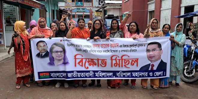 বিএনপি’র ভারপ্রাপ্ত চেয়ারম্যান তারেক রহমানের বিরুদ্ধে কুরুচিপূর্ণ স্লোগান ও বিএনপির কেন্দ্রীয় অফিসের সামনে ককটেল বিস্ফোরণ ও নাশকতার প্রতিবাদে বাংলাদেশ জাতীয়তাবাদী মহিলা দল বরিশাল মহানগর জেলা উদ্যোগে বিক্ষোভ মিছিল অনুষ্ঠিত হয়।