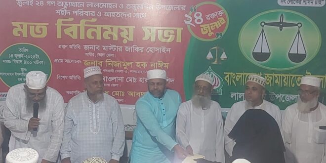 ভোলা লালমোহন উপজেলা জামায়াতে ইসলামীর উদ্যোগে ১৪ জুলাই (রবিবার) বিকাল ৪টায় লালমোহন ইসলামিয়া কামিল মাদ্রাসা প্রাঙ্গণে ২০২৪ইং সালের ঐতিহাসিক “জুলাই বিপ্লব” এ শহীদ ও আহতদের পরিবারের সদস্য ও আহতদের নিয়ে এক মতবিনিময় সভা করা হয়েছে । এ অনুষ্ঠানে তাদেরকে আর্থিক অনুদান প্রদান করা হয়।