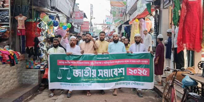 গতকাল ১৬ জুলাই বুধবার বাংলাদেশ জামায়াতে ইসলামী পিরোজপুর পৌরসভার উদ্যোগে মিছিল অনুষ্ঠিত হয় যা ১৯ জুলাই ঢাকায় অনুষ্ঠিত হতে যাওয়া জাতীয় মহাসমাবেশকে সফল করার লক্ষ্যে মিছিলটি পরিচালিত হয়। পৌর জামায়াতের আমীর ইসহাক আলী খানের নেতৃত্বে মিছিলে অংশগ্রহণ করেন পিরোজপুর জেলা জামায়াতের সেক্রেটারি অধ্যক্ষ জহিরুল হকসহ অন্যান্য নেতা-কর্মীরা।