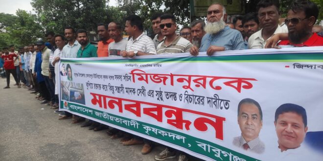 বরিশালের বাবুগঞ্জ উপজেলার কেদারপুর ইউনিয়নে কৃষক দলের সদস্য সচিব মিজানুর রহমানকে কুপিয়ে গুরুতর আহত করার প্রতিবাদে মানববন্ধন করা হয়েছে।