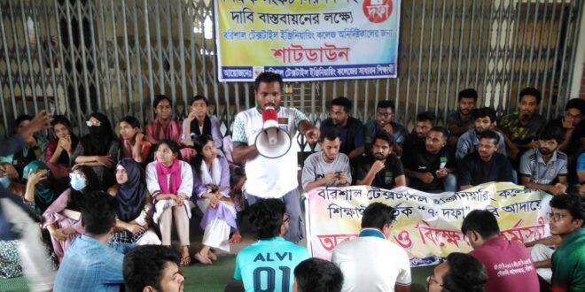শিক্ষক সংকট নিরসনসহ ৭দফা দাবি আদায়ের লক্ষ্যে শাটডাউন কর্মসূচি পালন করেছেন বরিশাল টেক্সটাইল ইঞ্জিনিয়ারিং কলেজের শিক্ষার্থীরা। বুধবার দুপুর ১২টায় কলেজের প্রশাসনিক ভবনের প্রধান ফটকে তালা ঝুলিয়ে দিয়ে বিক্ষোভ কর্মসূচি পালন করেন তারা।