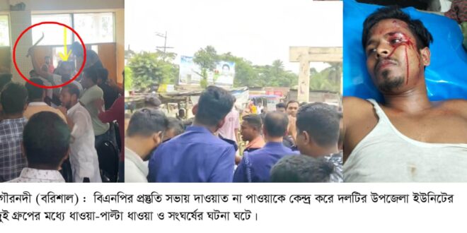 বরিশালের গৌরনদীতে ৫আগস্টের কর্মসূচিকে কেন্দ্র করে উপজেলা বিএনপির প্রস্তুতি সভায় আমন্ত্রণ না পাওয়াকে কেন্দ্র করে দলটির দুই গ্রুপের মধ্যে ধাওয়া-পাল্টা ধাওয়া ও সংঘর্ষের ঘটনা ঘটেছে। এতে এক যুবক আহত হয়েছেন।
