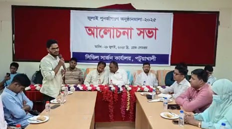 ২৮জুলাই (সোমবার) সকাল ১০টা ৩০মিনিটে পটুয়াখালী সিভিল সার্জন কার্যালয় সভাকক্ষে অনুষ্ঠিত হয় “জুলাই পুনর্জাগরণ অনুষ্ঠানমালা-২০২৫ ও আলোচনা সভা”। আয়োজক ছিলেন জেলা সিভিল সার্জন ডা. খালেদুর রহমান মিয়া। কিন্তু এই আয়োজনের পেছনের ইতিহাসই এখন প্রশ্নবিদ্ধ।
