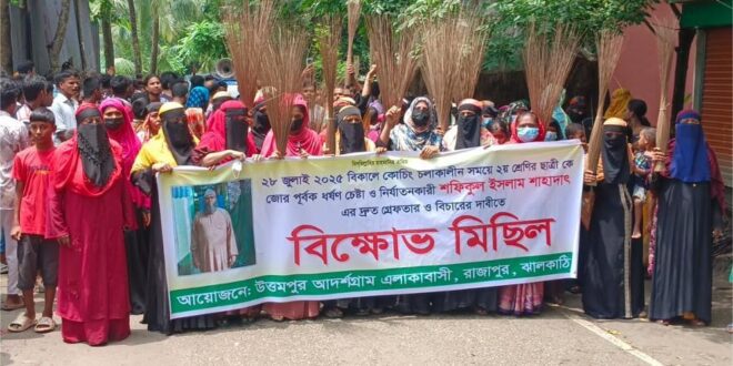 ঝালকাঠির রাজাপুরের উত্তমপুর গুচ্ছগ্রাম এলাকায় দ্বীতিয় শ্রেণির এক শিশু শিক্ষার্থীকে যৌন নিপীড়নের মামলার আসামী আদর্শগ্রাম নূরানী মাদ্রাসার প্রতিষ্ঠাতা ও শিক্ষক শফিকুল ইসলাম শাহাদাৎ হোসেনের গ্রেফতার ও বিচারের দাবিতে মানববন্ধন, ঝাড়ু মিছিল ও সড়ক অবরোধ করে করেছে এলাকাবাসী।
