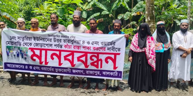 রাজাপুর উপজেলার সাতুরিয়া ইউনিয়নের উত্তর তারাবুনিয়া এলাকার কাঁচাসড়ক পাকা করণের দাবিতে এক মানববন্ধন অনুষ্ঠিত হয়েছে।শনিবান (২আগষ্ট) সকাল এগারোটায় এই মানববন্ধনে অংশ নেন সাতুরিয়া ইউনিয়ন এর ৪ ও ৫ নং ওয়ার্ডের বিভিন্ন শিক্ষাপ্রতিষ্ঠানের শিক্ষার্থী ও এলাকাবাসী।