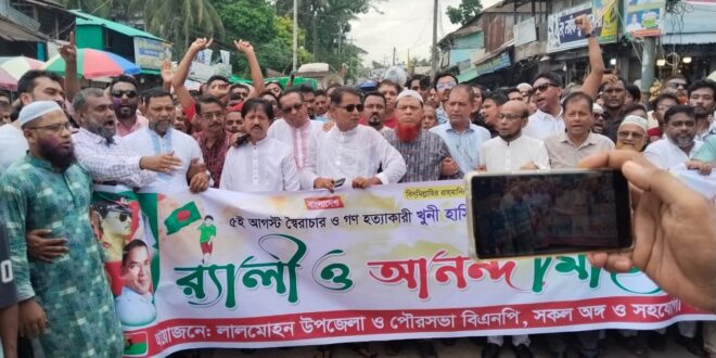 লালমোহন (ভোলা) প্রতিনিধি জুলাই গন-অভ্যুত্থানের বর্ষপূর্তিতে ভোলার লালমোহন উপজেলা ও পৌর বিএনপির আয়োজনে আনন্দ র্যালী ও আলোচনা সভা অনুষ্ঠিত হয়েছে। পৌর বিএনপির সভাপতি ছাদেক মিয়া জান্টুর সভাপতিত্বে আনন্দ মিছিল পরবর্তী আলোচনা সভায় প্রধান অতিথির বক্তব্য রাখেন উপজেলা বিএনপির নব নির্বাচিত সভাপতি সাবেক রমাগঞ্জ ইউনিয়ন চেয়ারম্যান জাফর ইকবাল।