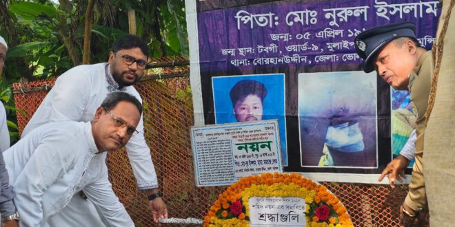 রিয়াজ ফরাজি: যথাযথ মর্যাদা ও ভাবগাম্ভীর্যের মধ্য দিয়ে বোরহানউদ্দিনে পালিত হয়েছে ‘জুলাই গণঅভ্যুত্থান দিবস’ ২০২৫। এ উপলক্ষে উপজেলা প্রশাসন বিভিন্ন কর্মসূচি গ্রহণ করে। ভোলা জেলা প্রশাসকের নির্দেশনা অনুযায়ী, দিবসটি পালনের মূল লক্ষ্য ছিল শহীদদের আত্মত্যাগকে স্মরণ করা।দিবসের শুরুতে, বোরহানউদ্দিন উপজেলার ০৭জন শহীদের সমাধিতে শ্রদ্ধাঞ্জলি নিবেদন করা হয়। উপজেলা নির্বাহী কর্মকর্তা (ইউএনও) রায়হান উজ্জামান, সহকারী কমিশনার (ভূমি) বোরহানউদ্দিন পৌর প্রশাসক মেহেদী হাসান ও বোরহানউদ্দিন থানার ওসি মো. সিদ্দিকুর রহমান সহ অন্যান্য সরকারি কর্মকর্তারা পুষ্পস্তবক অর্পণ করেন।