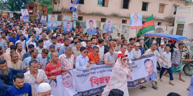 মঙ্গলবার (৫ আগস্ট ২০২৫) সকাল ১০ টায় ভোলা ২ আসনের সাবেক এমপি ও বাংলাদেশ জাতীয়তাবাদী দল বিএনপি’র নির্বাহী কমিটির অন্যতম সদস্য হাফিজ ইব্রাহিমের নির্দেশে’বোরহানউদ্দিন উপজেলা বিএনপির আহবায়ক মাফরুজা সুলতানার নেতৃত্বে বোরহানউদ্দিন উপজেলা বিএনপির কার্যালয় চত্বর থেকে বিজয় মিছিল বের হয়ে পৌর বাজার,বোরহানউদ্দিন থানার মোড়,বোরহানউদ্দিন উপজেলা,উত্তর বাস স্ট্যান্ড সহ গুরুত্বপূর্ণ সড়কগুলো প্রদক্ষিণ করে একই স্থানে এসে শেষ হয়।
