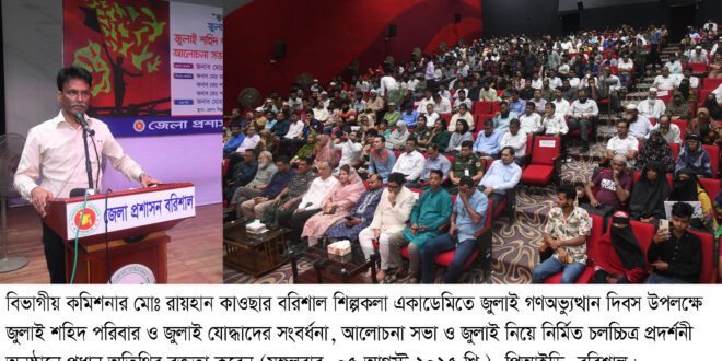 ৫ আগস্ট মঙ্গলবার জেলা শিল্পকলা একাডেমি হলরুমে জুলাই গণঅভ্যুত্থান দিবস উপলক্ষে জুলাই শহিদ পরিবার ও যোদ্ধাদের সংবর্ধনা, আলোচনা সভা এবং জুলাই নিয়ে নির্মিত চলচ্চিত্র প্রদর্শনী অনুষ্ঠানে প্রধান অতিথির বক্তৃতায় বিভাগীয় কমিশনার এ কথা বলেন।