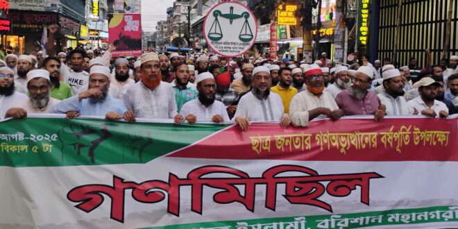 মিছিল পূর্ব সমাবেশে সভাপতিত্ব করেন কেন্দ্রীয় কর্মপরিষদ সদস্য ও বরিশাল মহানগর জামায়াতের আমীর অধ্যক্ষ জহির উদ্দিন মু. বাবর। সভাপতির বক্তব্যে মহানগর আমীর বলেন, শেখ হাসিনা বলছিল শেখের বেটি পালায় না কিন্তু আমরা দেখলাম ৫ই আগষ্ট গনবিপ্লবে গুষ্টি শুদ্ধো পালিয়ে গেছে। বিপ্লব পরবর্তী এক বছরেও আমরা খুনিদের বিচার করতে পারিনি, অনতিবিলম্বে খুনিদের বিচার নিশ্চিত করতে হবে।