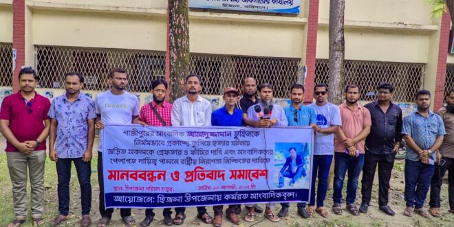 গাজীপুরের চৌরাস্তায় মসজিদ মার্কেটে দৈনিক প্রতিদিনের কাগজ-এর স্টাফ রিপোর্টার আসাদুজ্জামান তুহিনকে নৃশংসভাবে হত্যার প্রতিবাদে ও দ্রুত বিচার দাবিতে মানববন্ধন করেছে হিজলায় কর্মরত সাংবাদিকবৃন্দ।