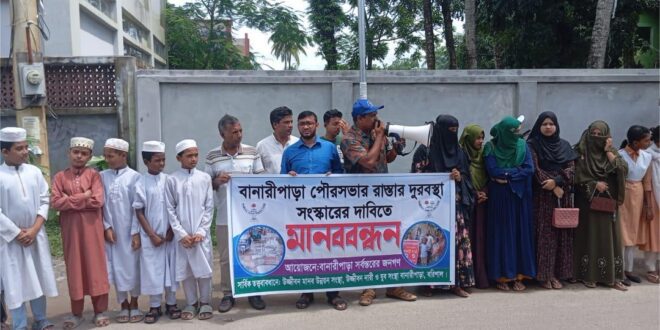 বানারীপাড়ায় উজ্জীবন মানব কল্যান সংস্থার উদ্দ্যোগে পৌর শহরের বিপর্যস্ত রাস্তাঘাট সংস্কারের দাবিতে মানববন্ধন অনুষ্ঠিত হয়েছে।