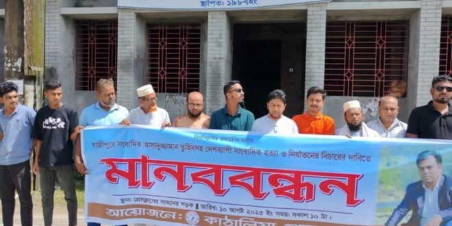 গাজীপুরের দৈনিক প্রতিদিনের কাগজ এর স্টাফ রিপোর্টার আসাদুজ্জামান তুহিন হত্যার বিচারের দাবিতে ঝালকাঠির কাঠালিয়া প্রেসক্লাবের উদ্যোগে মানববন্ধন অনুষ্ঠিত হয়েছে।