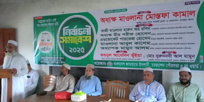 শুক্রবার ২২ আগস্ট বিকেল ৪টায় চরফ্যাশন করিমজান মহিলা কামিল মাদ্রাসার হলরুমে চরফ্যাশন পৌরসভা ৫ নং ওয়ার্ড জামায়াতে ইসলামীর আয়োজনে এক নির্বাচনী সমাবেশে প্রধান অতিথির বক্তব্যে তিনি এসব কথা বলেন।