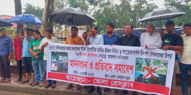 শনিবার ভোলা প্রেসক্লাব, ভোলা টেলিভিশন জার্নালিস্ট অ্যাসোসিয়েশন এবং ভোলা টেলিভিশন ক্যামেরা জার্নালিস্ট অ্যাসোসিয়েশনের যৌথ আয়োজনে প্রেসক্লাবের সামনে এই মানববন্ধন অনুষ্ঠিত হয়।