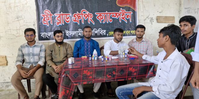 সচেতনতা বৃদ্ধি ও মানবিক মূল্যবোধ জাগ্রত করার লক্ষ্যে ফ্রি ব্লাড গ্রুপিং ক্যাম্পেইনের আয়োজন করেছে বাংলাদেশ ইসলামী ছাত্রশিবির ভোলা শহর শাখার আওতাধীন ভোলা সদর দক্ষিণ থানা শাখা। দিনব্যাপী আয়োজিত এ ক্যাম্পেইনে বিপুল সংখ্যক শিক্ষার্থী ও স্থানীয় তরুণরা অংশগ্রহণ করে নিজেদের রক্তের গ্রুপ নির্ণয় করেন।