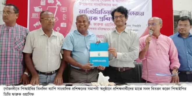 প্রেস ইনস্টিটিউট অব বাংলাদেশ (পিআইবি) এর উদ্যোগে বরিশালের গৌরনদী ও আগৈলঝাড়া উপজেলায় কর্মরত সাংবাদিকদের মাল্টিমিডিয়া জার্নালিজম বিষয়ক তিন দিনব্যাপী প্রশিক্ষনের সমাপনী অনুষ্ঠান সনদ বিতরন সোমবার সকালে উপজেলা পরিষদ মিলনায়তনে অনুষ্ঠিত হয়।