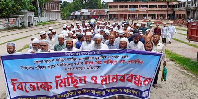 ভোলা দারুল হাদিস কামিল মাদ্রাসার মুহাদ্দিস ও ভোলা সদর উপজেলা পরিষদ জামে মসজিদের খতীব মাও. মো. আমিনুল হক নোমানীকে নৃশংসভাবে হত্যার বিচার দাবিতে বিক্ষোভ মিছিল ও মানববন্ধন করেছেন লালমোহন ইসলামিয়া কামিল মাদ্রাসার শিক্ষক-শিক্ষার্থীরা।