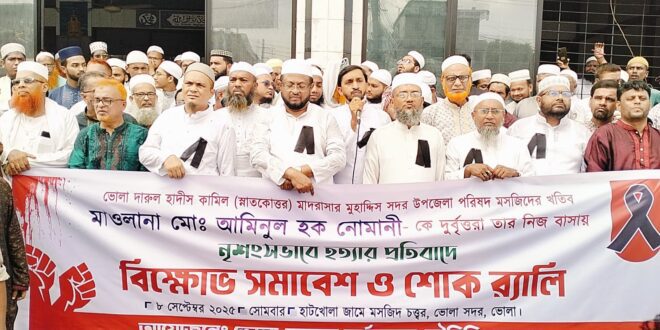 ভোলায় দারুল হাদিস কামিল মাদ্রাসার মোহাদ্দিস, সদর উপজেলা মসজিদের খতিব ও ইসলামী ঐক্য আন্দোলনের জেলা সেক্রেটারি মাওলানা মোঃ আমিনুল হক নোমানীকে নিজ বাড়িতে নৃশংসভাবে হত্যার প্রতিবাদে বিক্ষোভ সমাবেশ ও শোক র্যালি অনুষ্ঠিত হয়েছে।