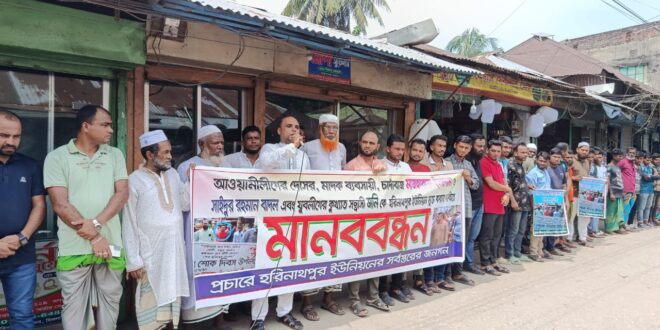 বরিশালের হিজলা উপজেলার হরিনাথপুর বাজারে বুধবার,সকাল ১১টায় স্থানীয় জনগণের ব্যানারে ইউনিয়ন বিএনপির যুগ্ম আহ্বায়ক মাজহারুল ইসলাম, বিএনপি নেতা সাইদুর রহমান বাদল মুন্সী ও ফ্যাসিস্টের দোসর যুবলীগ নেতা জনির বিরুদ্ধে একটি মানববন্ধন অনুষ্ঠিত হয়েছে।